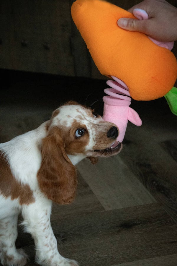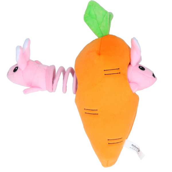 De Double Wobble Carrot Conejos zijn twee roze konijntjes, die zich thuis voelen in de grote knuffel in de vorm van een wortel! Beide konijntjes zijn voorzien van een pieper en worden verbonden door middel van een zachte, maar toch sterke springveer. Bij speeltijd springen ze dus tevoorschijn, om trekspelletjes met je hond dubbel zo leuk te maken! De Double Wobble Carrot Conejos beschikken bovendien over vijf andere Double Wobble-maatjes!